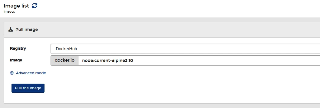 To pull images from Docker hub go to images on left menu, type in the name of the container and tag e.g node:current-alpine3.10. click on Pull the Image.