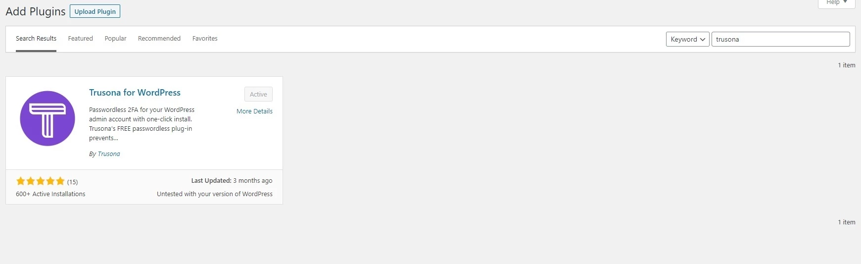 Go to Dashboard > Plugins > Add New and Search for Trusona